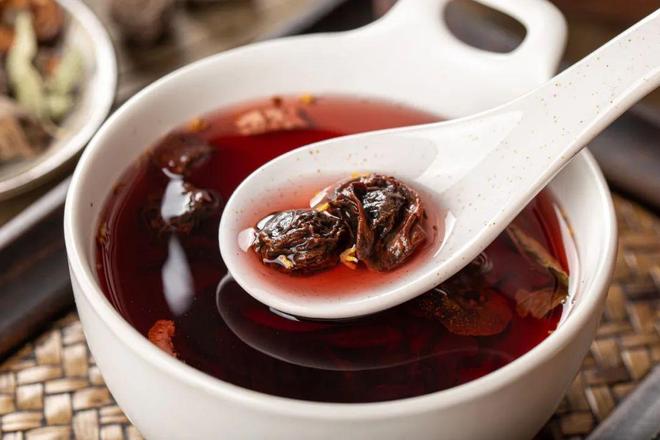 乌梅汤用乌梅、山楂、甘草、桂花煮水,酸甜开胃、收敛津液,适合夏季多汗人群。